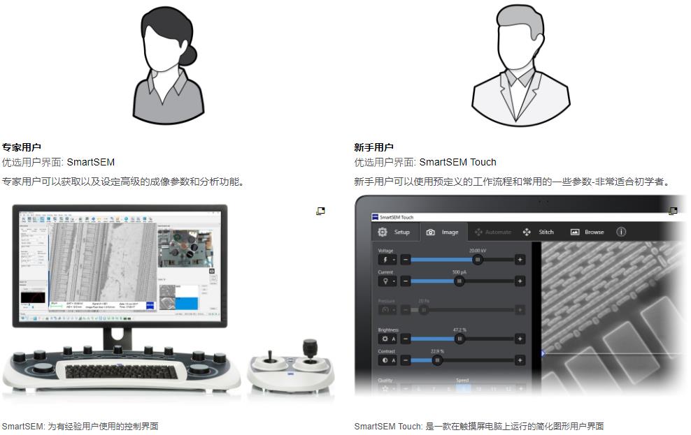 在实际的实验室环境中,SEM 的操作通常是显微镜专家的专属领域。但是对于非专家级用户来说,操作SEM就变得具有挑战,比如学生、受训者或质量工程师,他们往往也需要从 SEM获取数据。 EVO 则同时考虑了这两类用户的需求,用户界面选项既能满足有经验的显微镜专家也能满足非专业用户的操作需要。